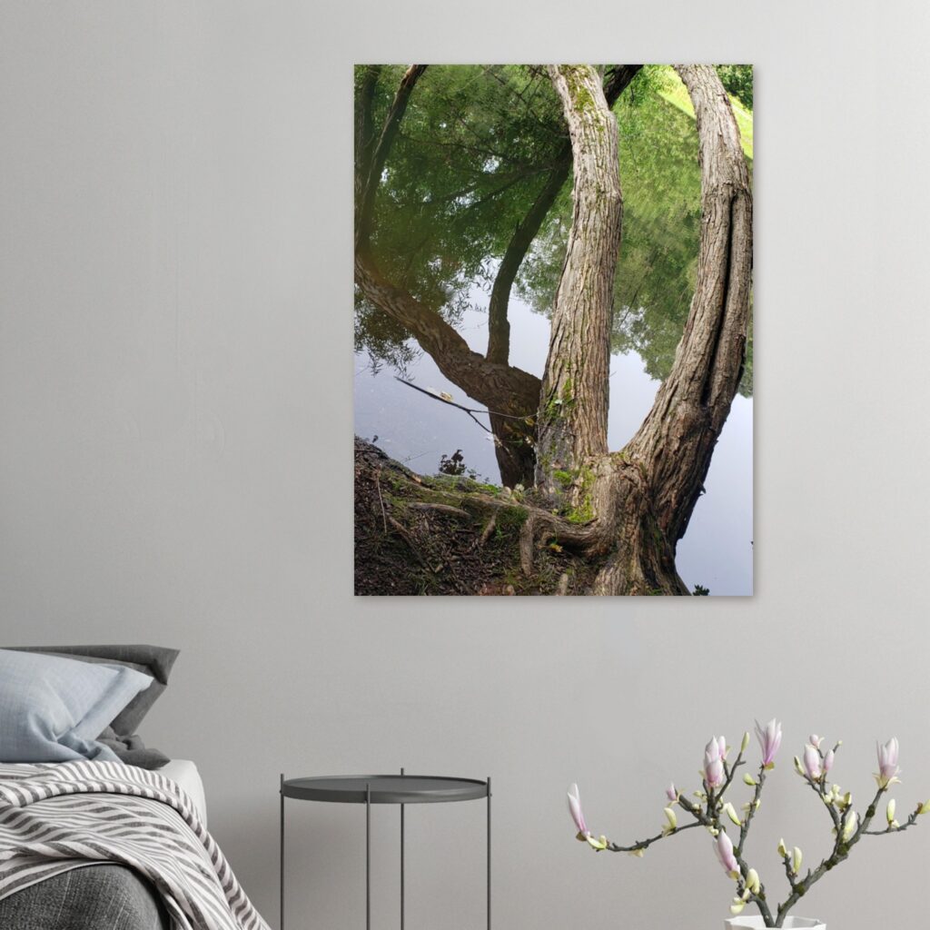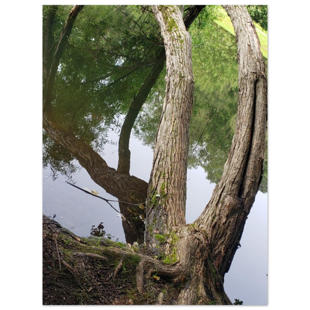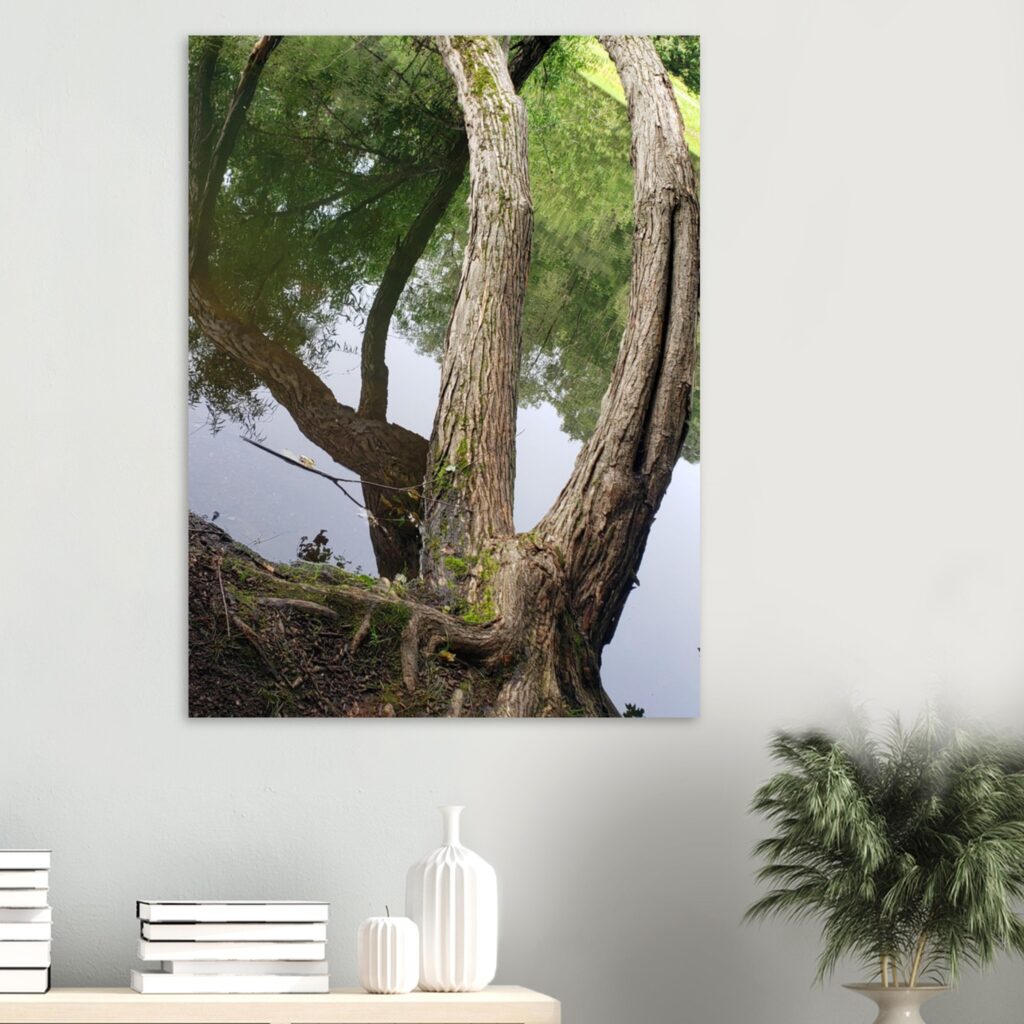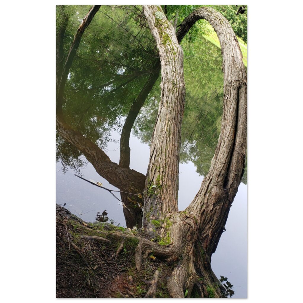 This Arched Tree Art Landscape Poster features a unique multi-trunked tree growing sideways and gracefully arching over a tranquil pond. The reflective water surface mirrors the soft sky and surrounding greenery, creating a peaceful and serene nature scene. A perfect addition to any space seeking calm and natural beauty, ideal for wall art, nature decor, or landscape photography enthusiasts.