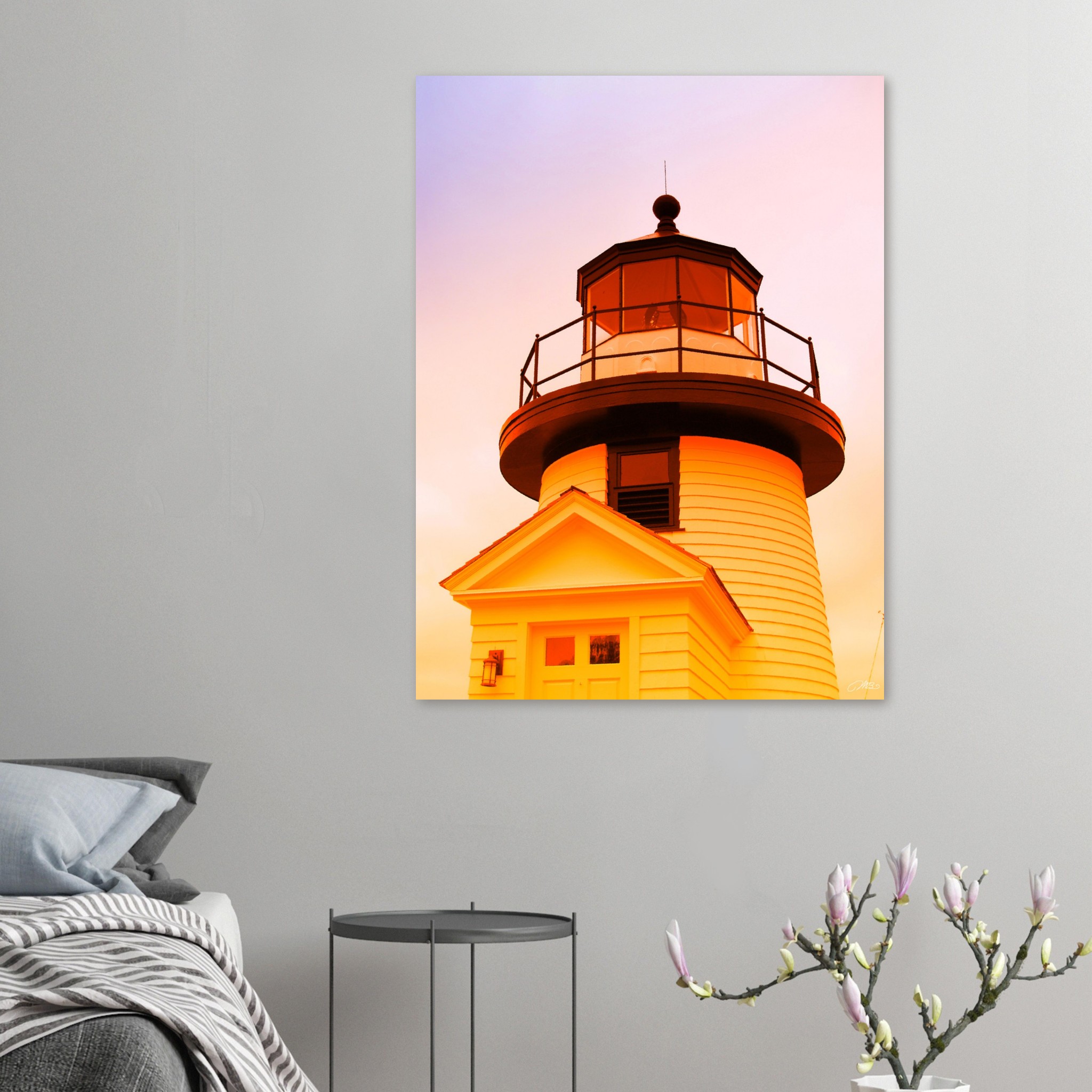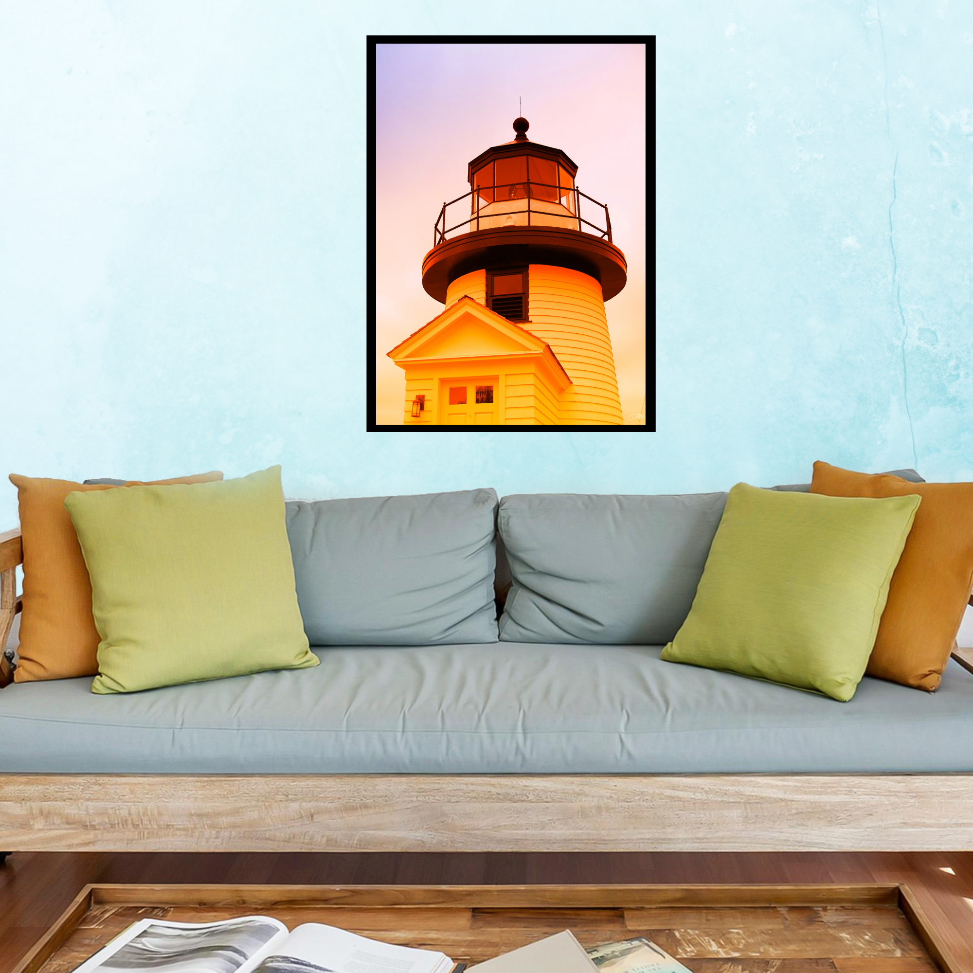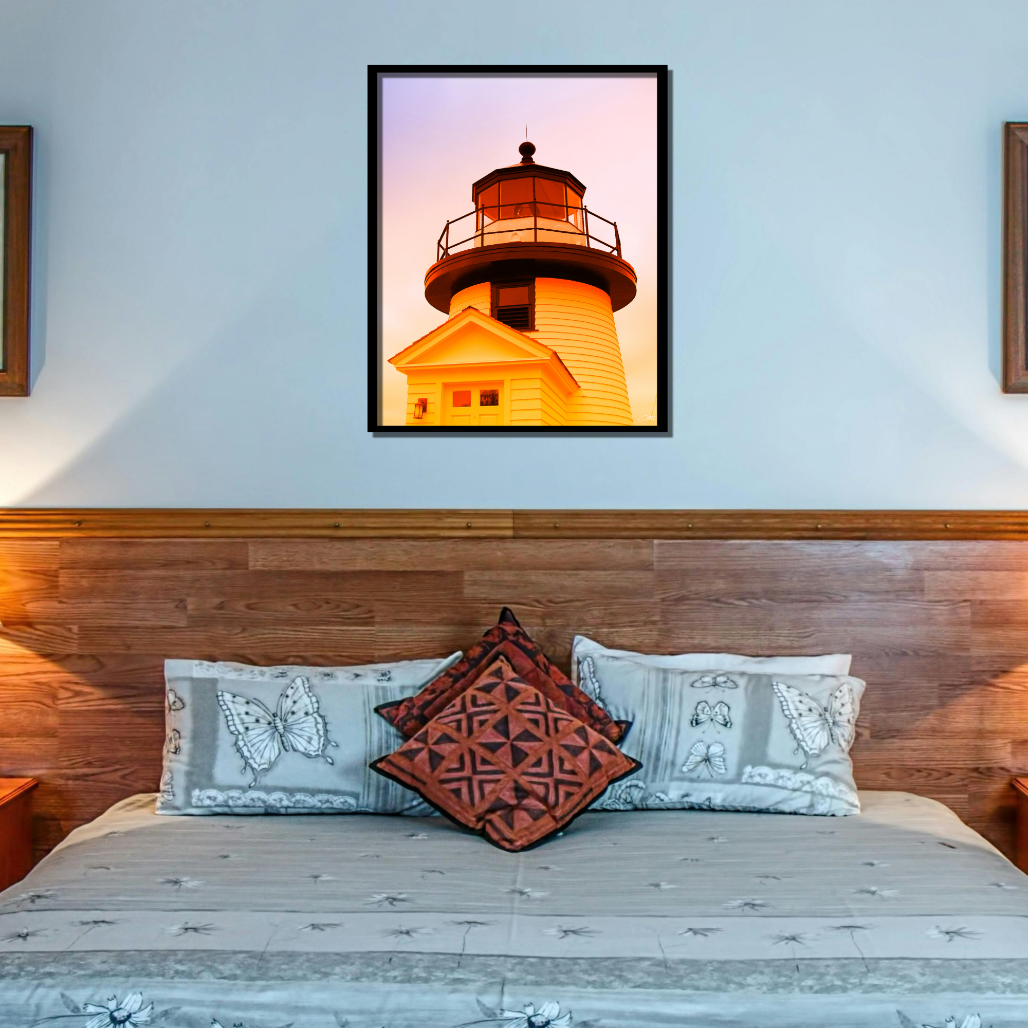 Capture the warm glow of golden hour with this Golden Lighthouse Sunset Wall Art Print. Featuring a classic coastal lighthouse illuminated by soft evening light, this serene nautical photography adds warmth and charm to any space. A beautiful home decor gift for beach lovers and coastal interiors.