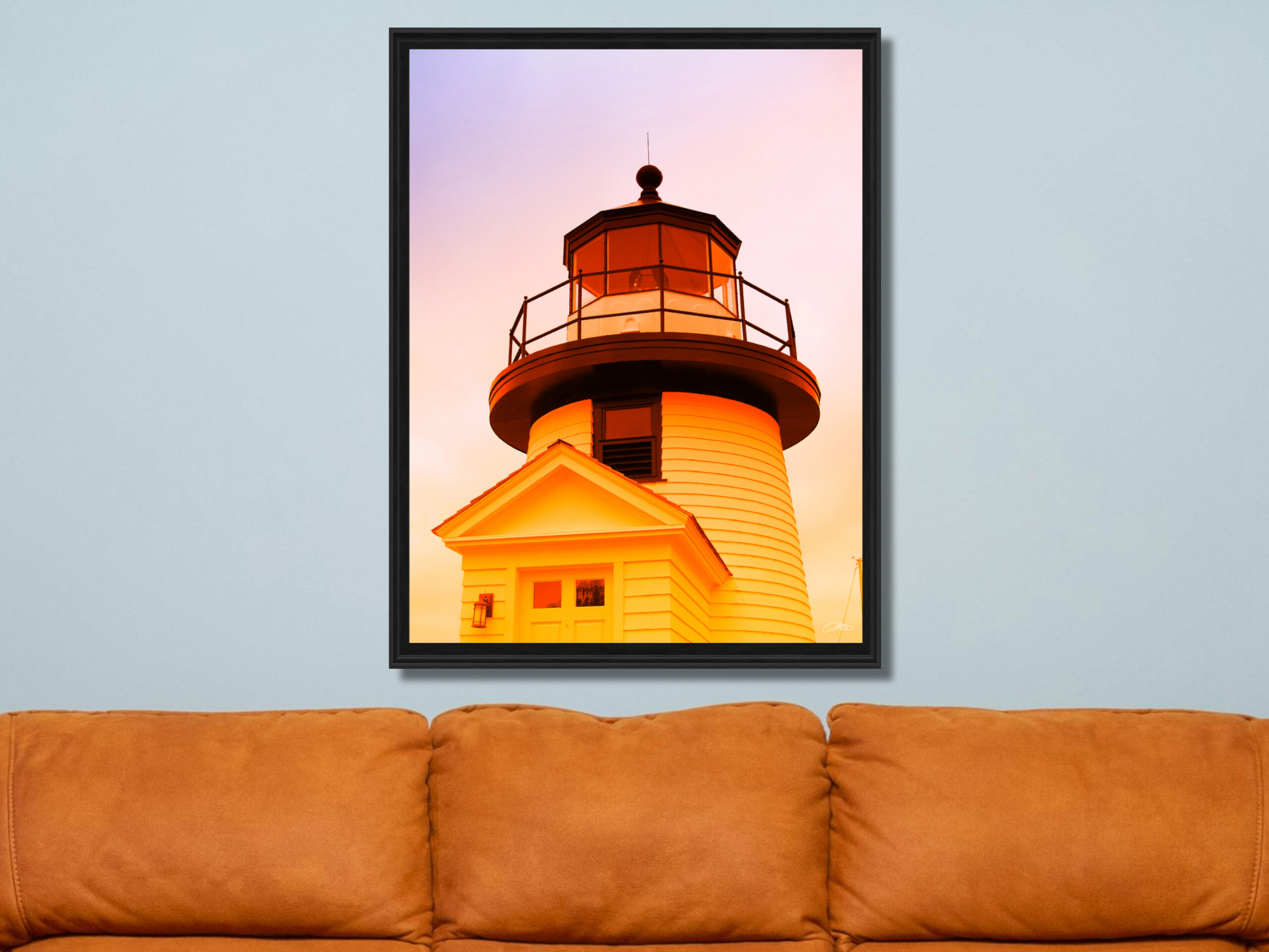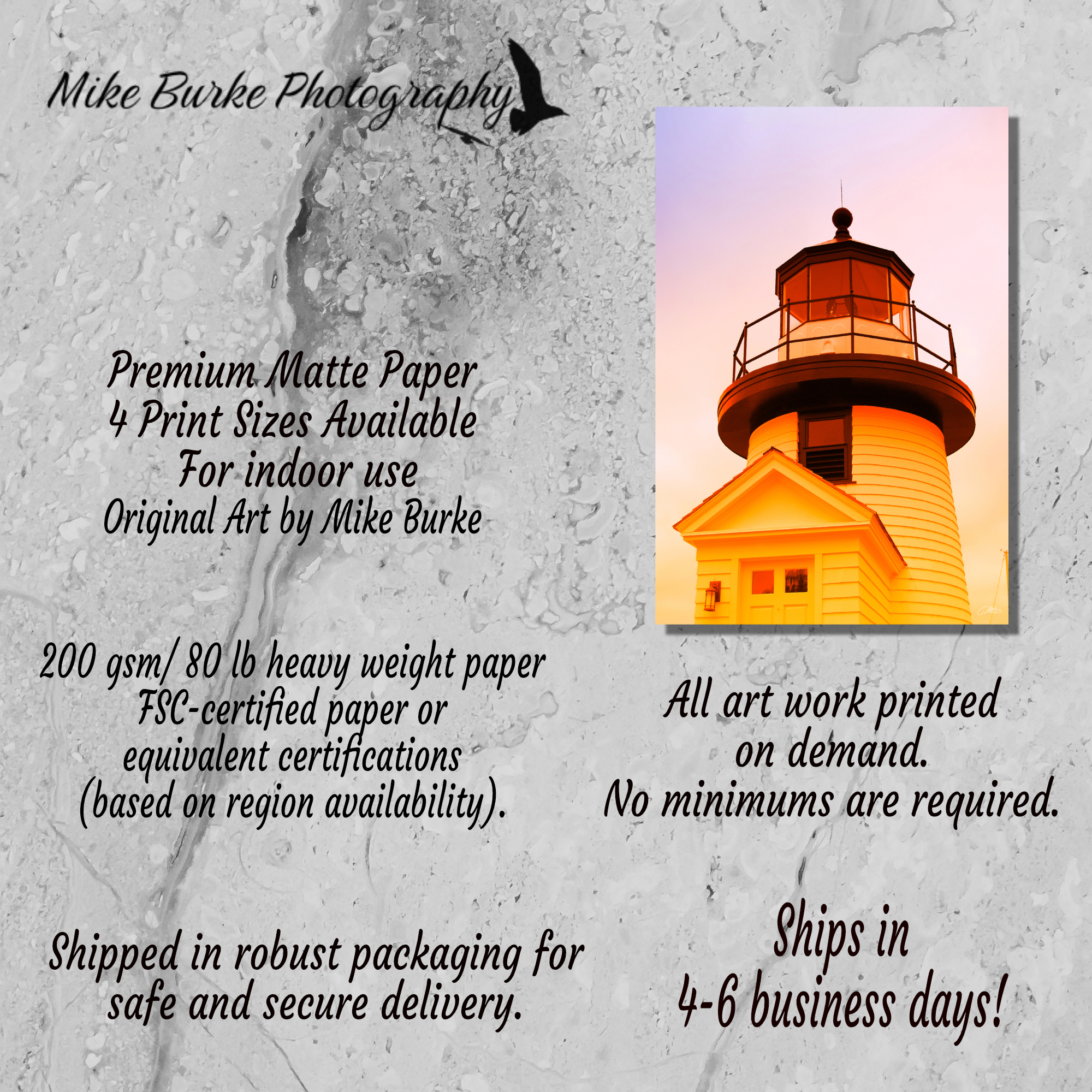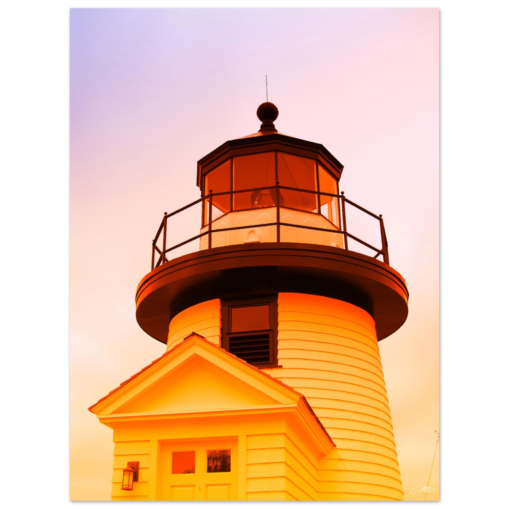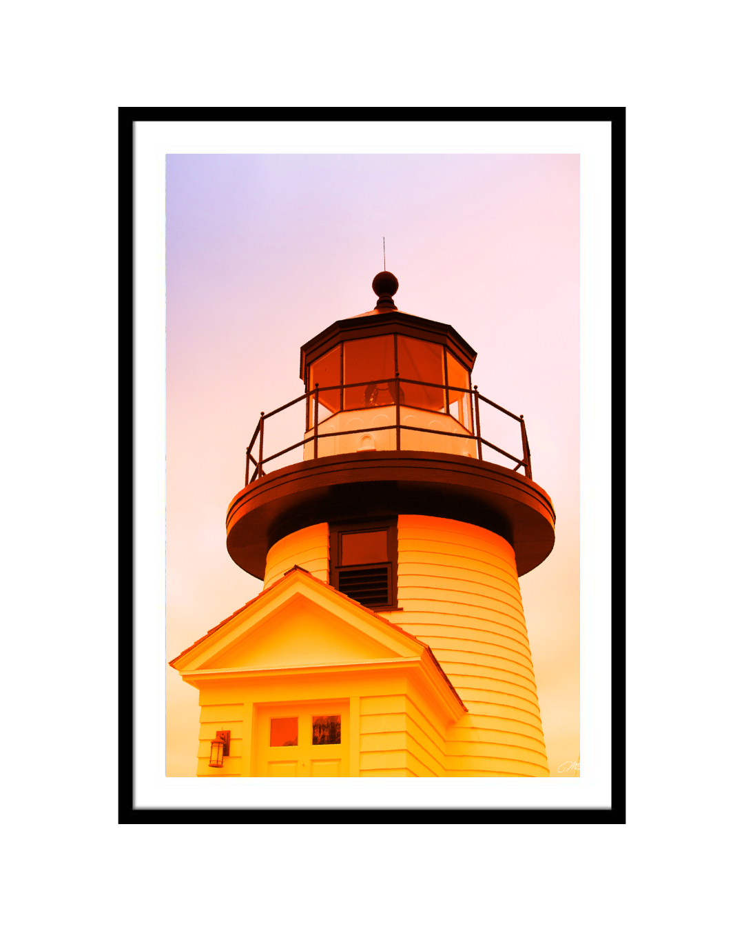 Capture the warm glow of golden hour with this Golden Lighthouse Sunset Wall Art Print. Featuring a classic coastal lighthouse illuminated by soft evening light, this serene nautical photography adds warmth and charm to any space. A beautiful home decor gift for beach lovers and coastal interiors.