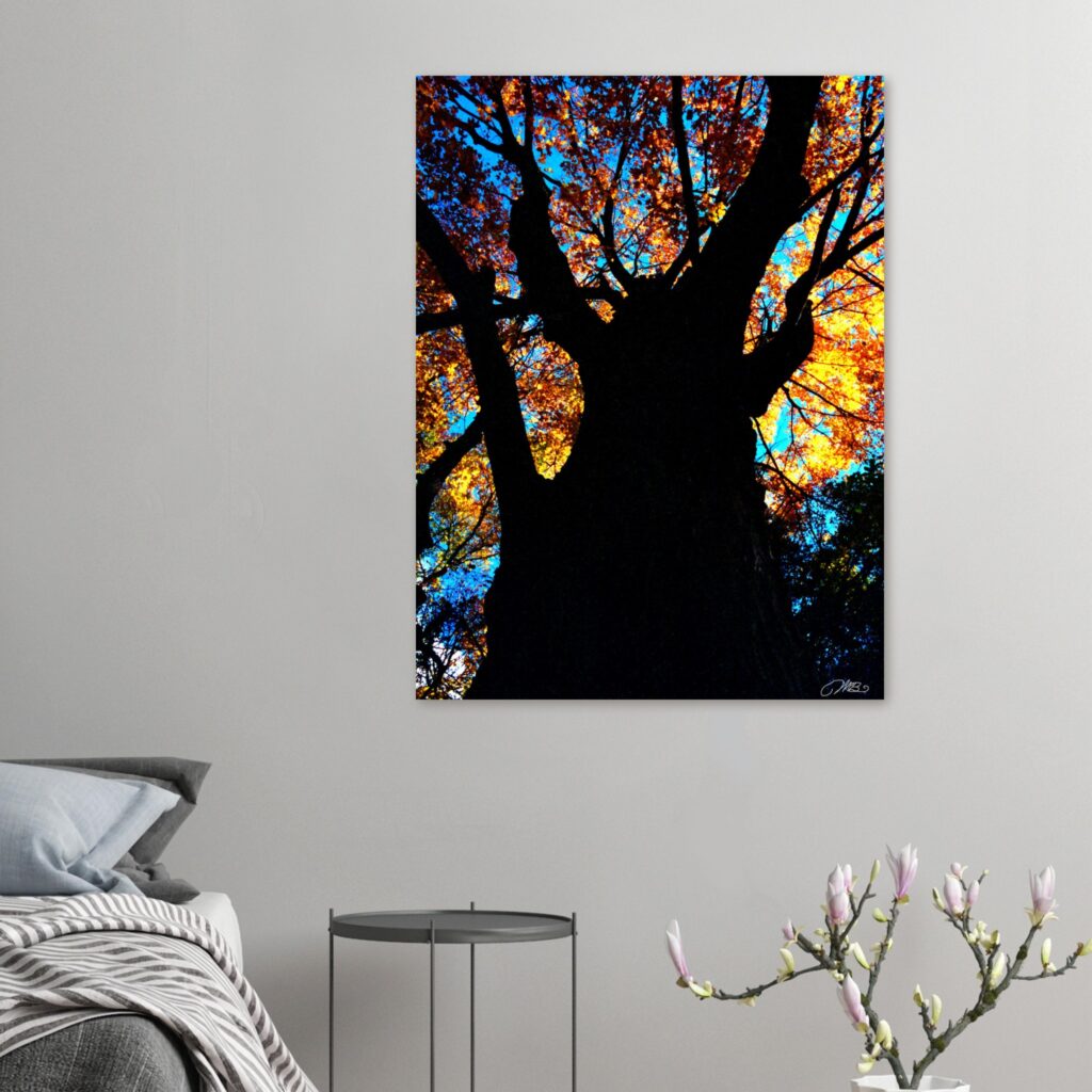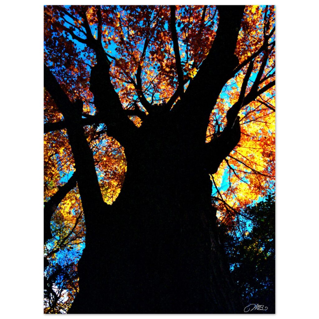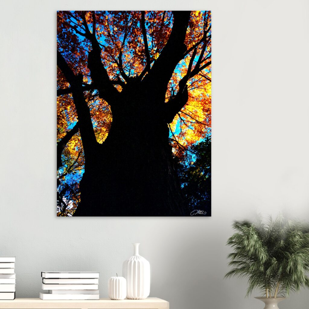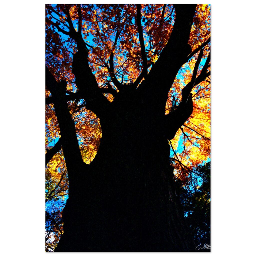 This Autumn Tree Art Print features a towering tree with glowing orange leaves against a turquoise sky. A bold and colorful piece of fall wall decor—order today and bring nature’s beauty into your home.