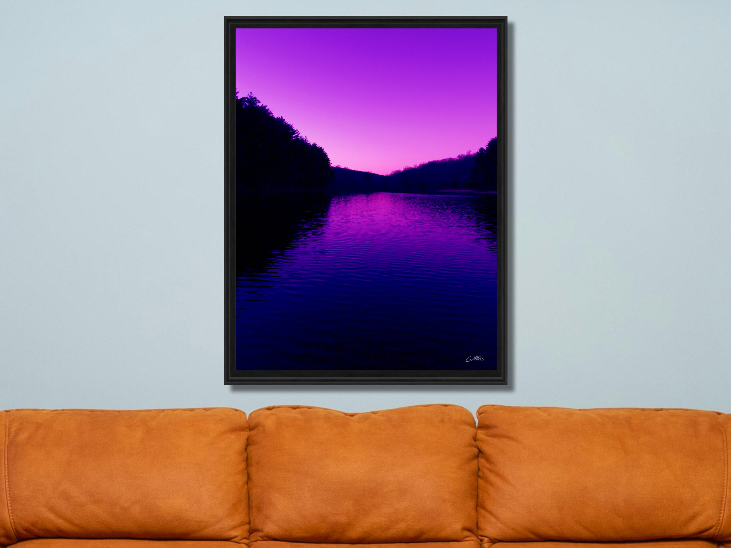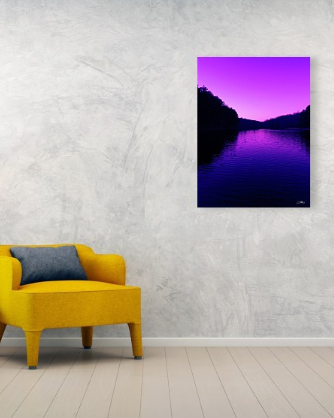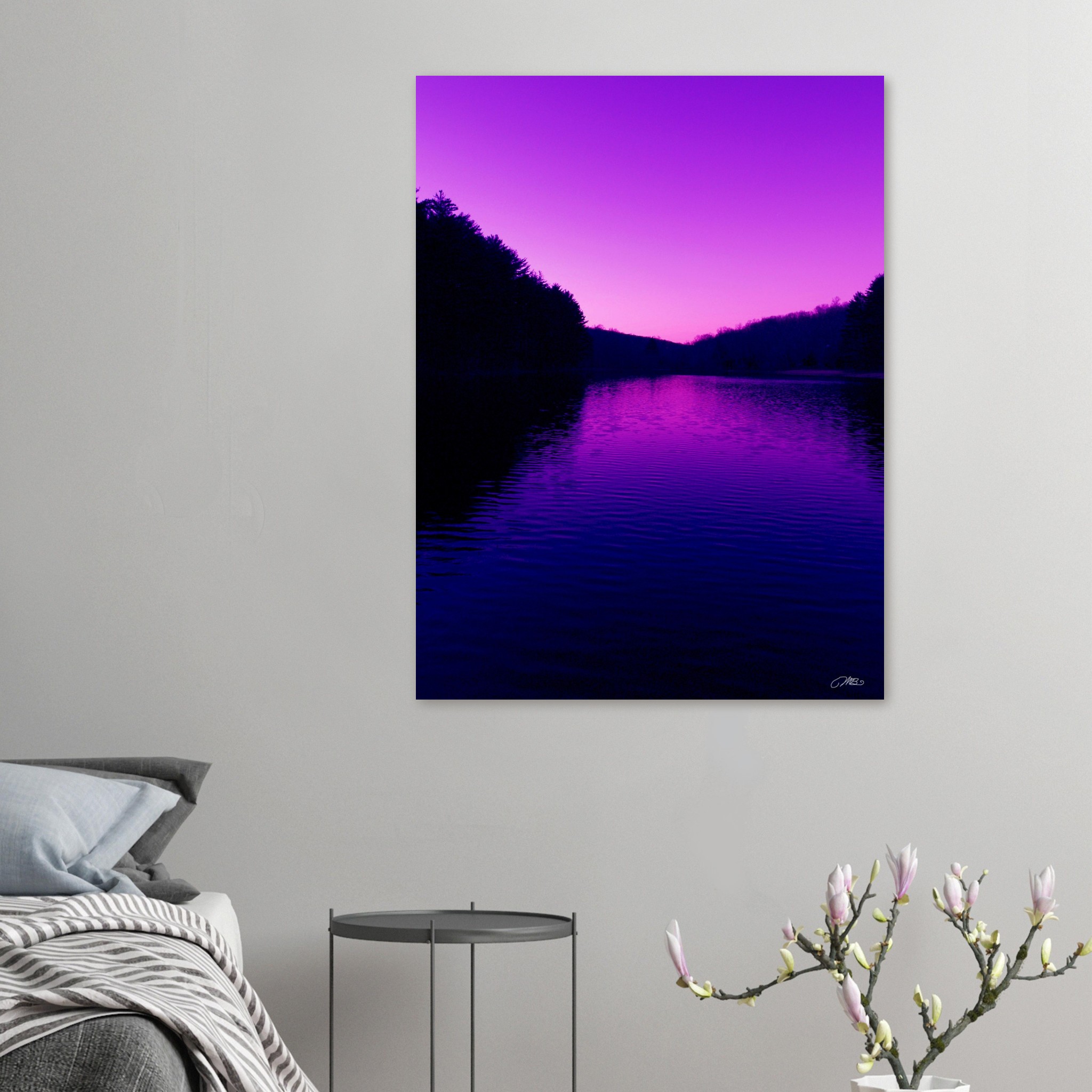 Make a bold statement with this purple sunset river wall art print. Featuring vivid pink and violet skies reflected over calm water with dark tree silhouettes, this dramatic landscape photography adds modern color and mood. A unique home decor gift for nature and sunset lovers.