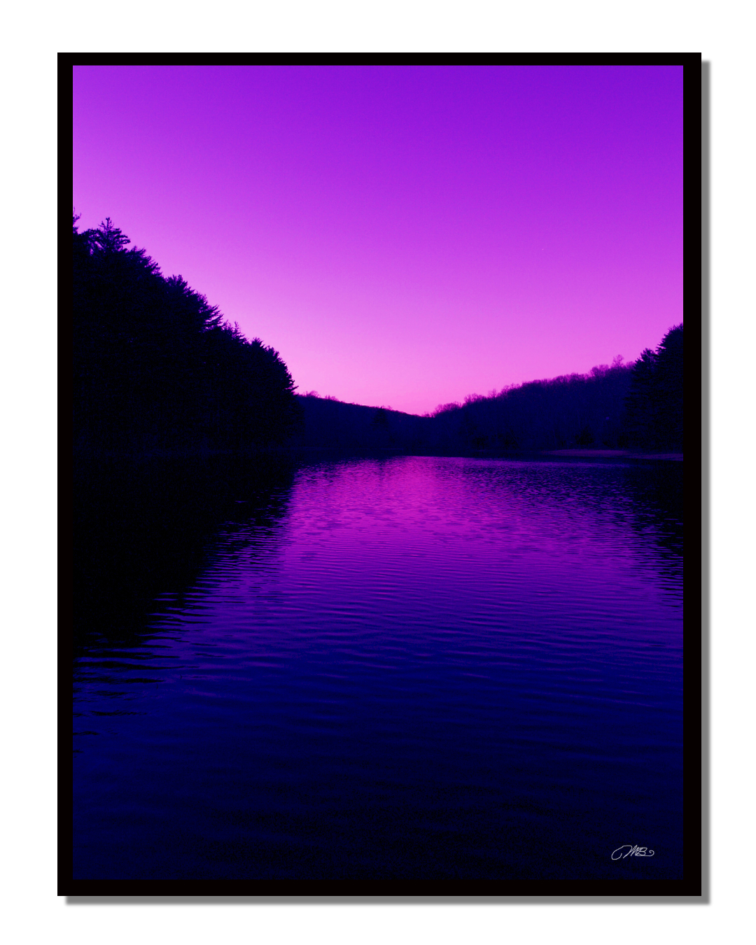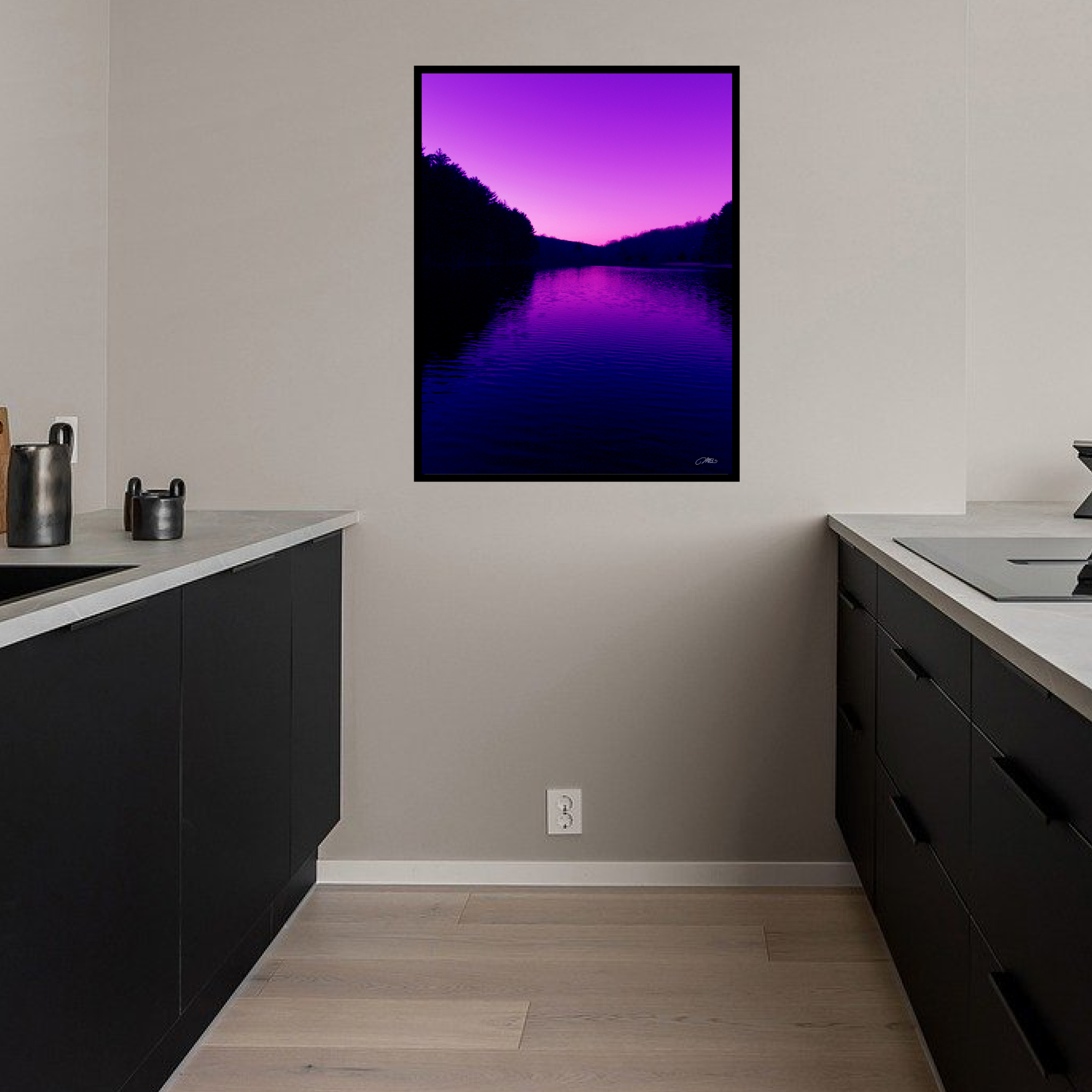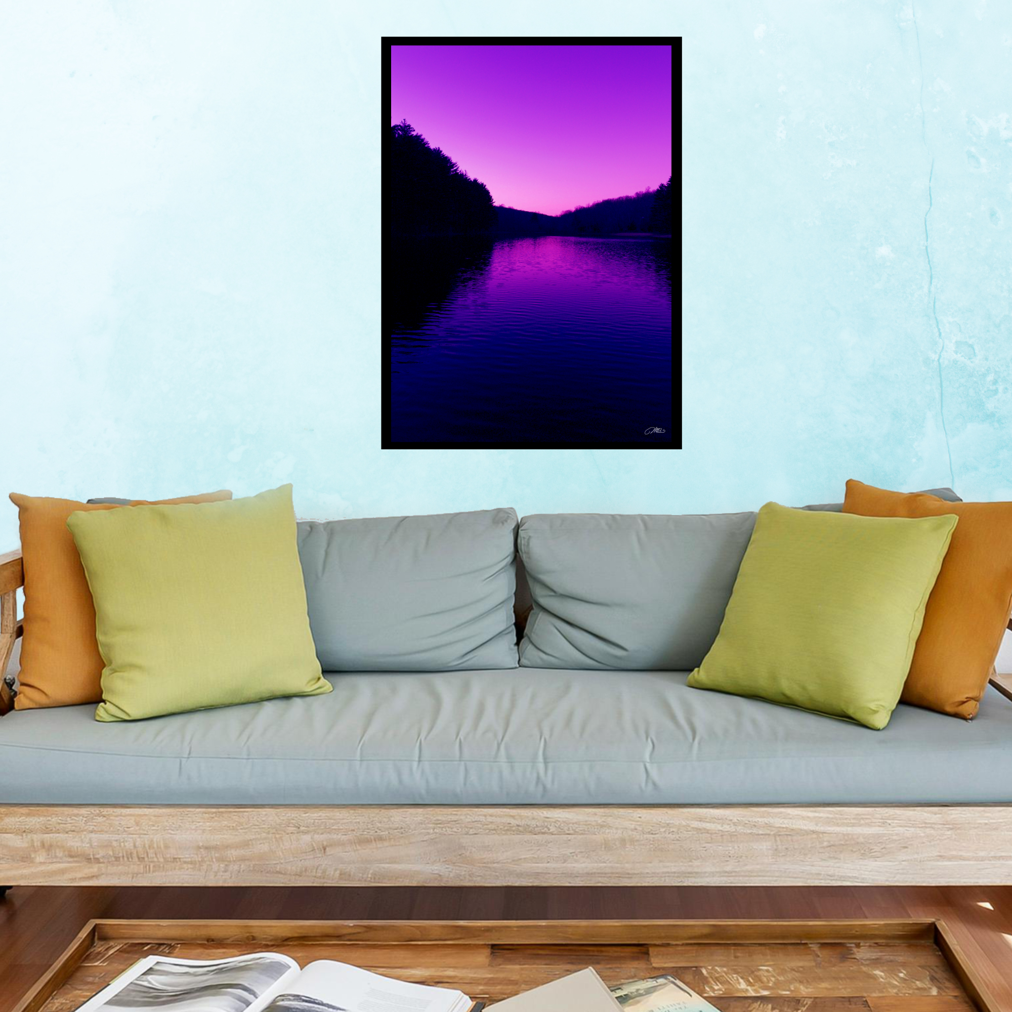 Make a bold statement with this purple sunset river wall art print. Featuring vivid pink and violet skies reflected over calm water with dark tree silhouettes, this dramatic landscape photography adds modern color and mood. A unique home decor gift for nature and sunset lovers.