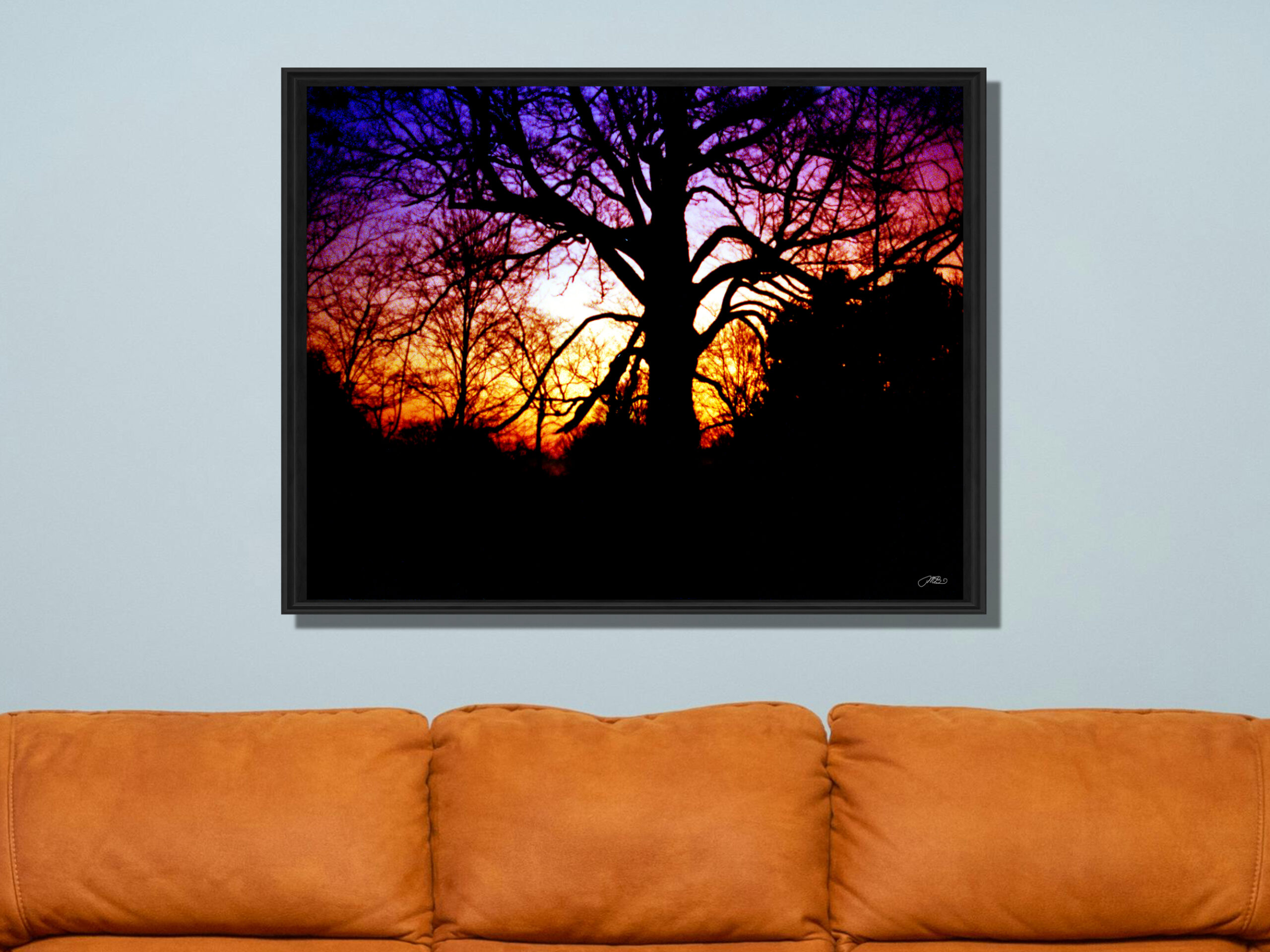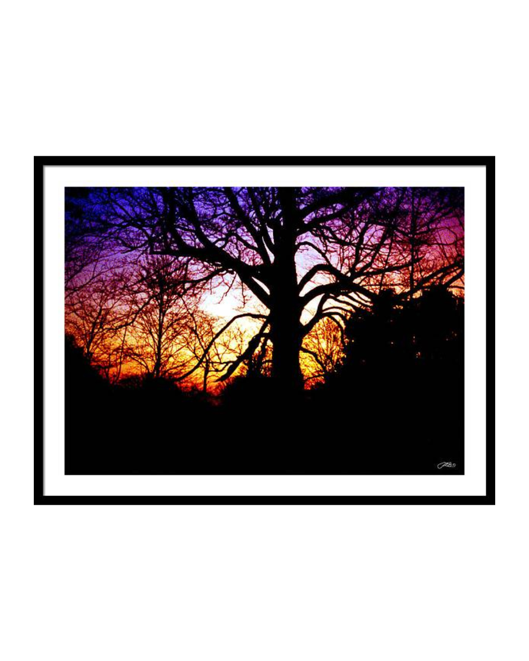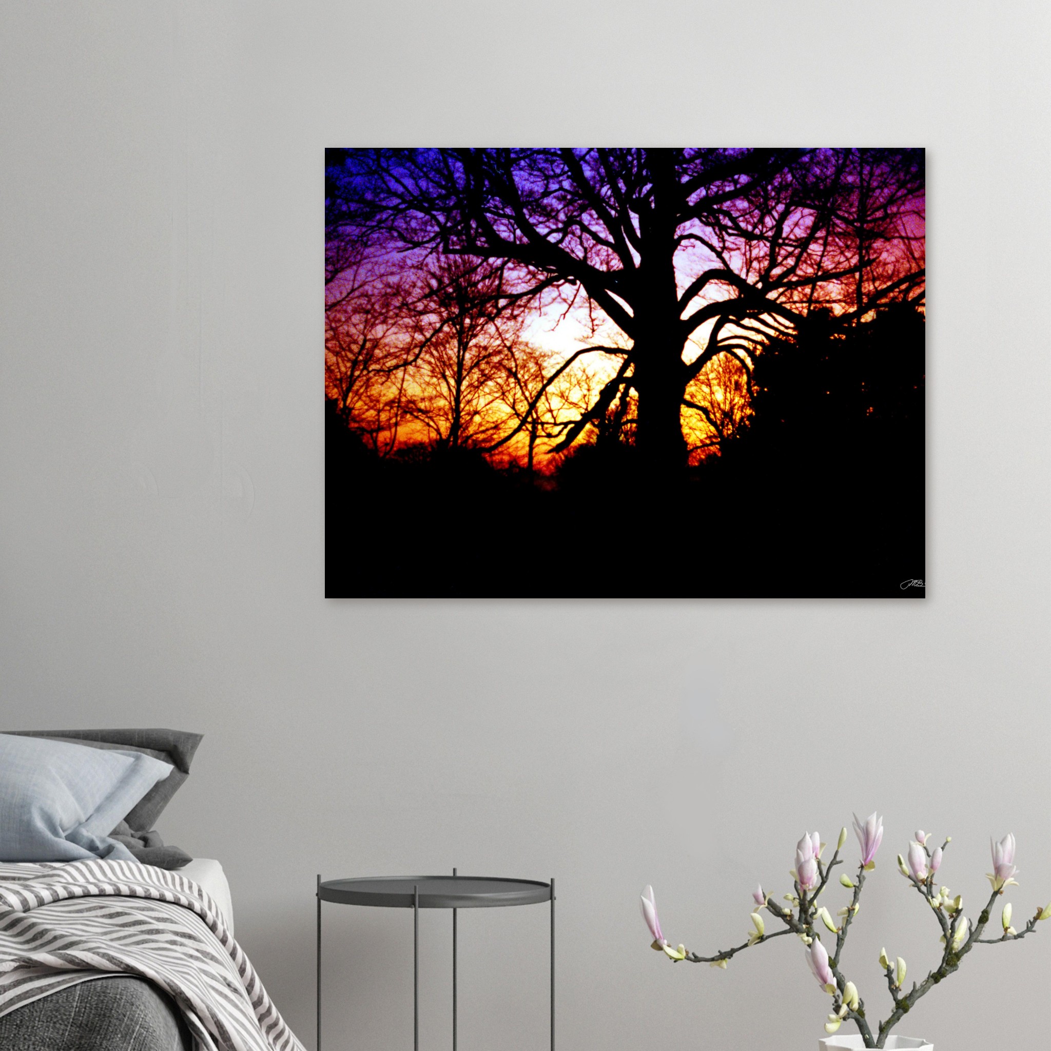 Bold and captivating, this silhouette tree sunset wall art print features striking black tree branches against a vibrant purple, pink, and orange sky. This dramatic landscape photography adds warmth and depth to any room and makes a stunning home decor gift for nature lovers.