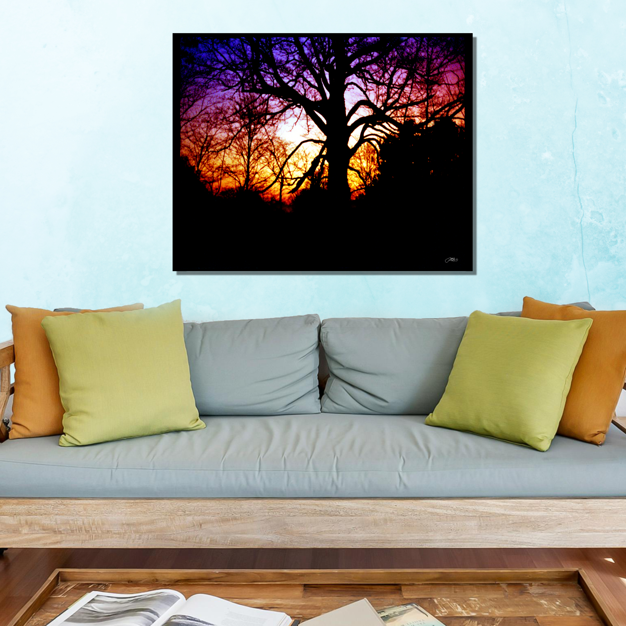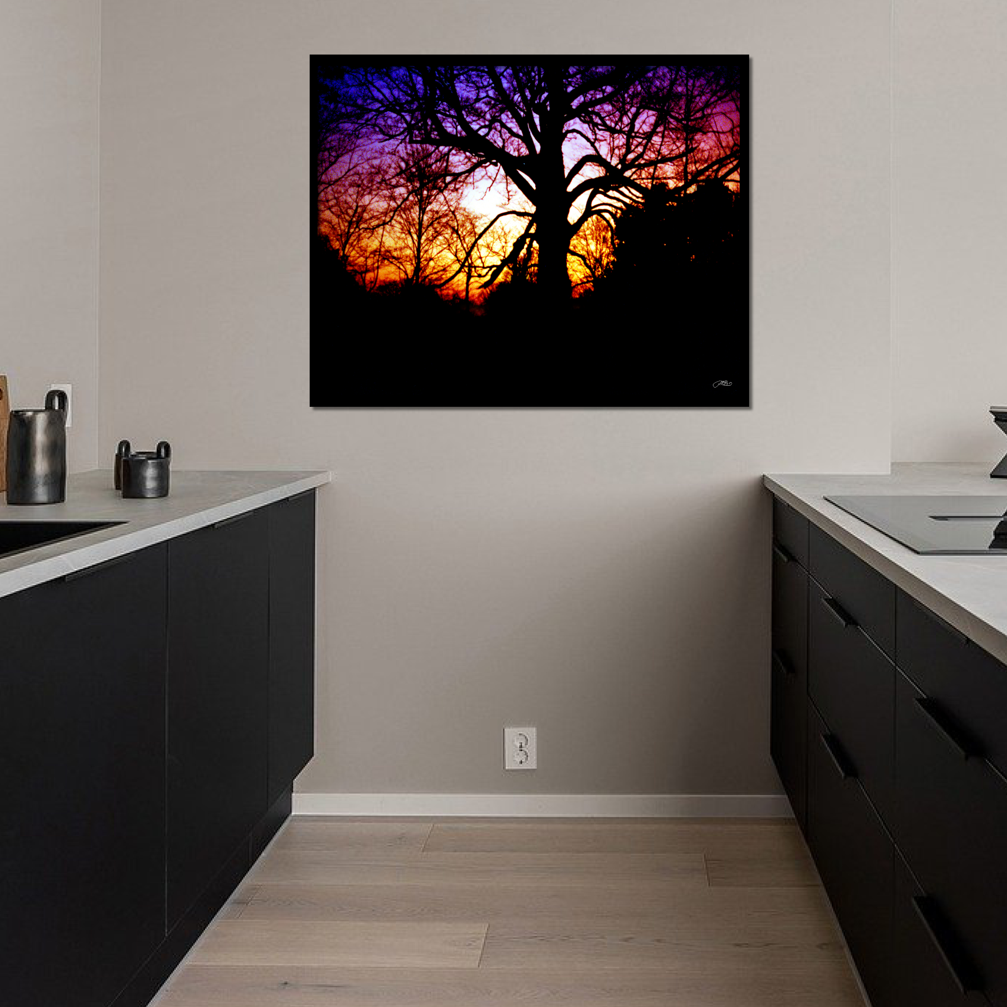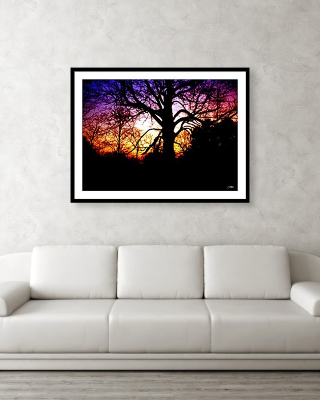 Bold and captivating, this silhouette tree sunset wall art print features striking black tree branches against a vibrant purple, pink, and orange sky. This dramatic landscape photography adds warmth and depth to any room and makes a stunning home decor gift for nature lovers.