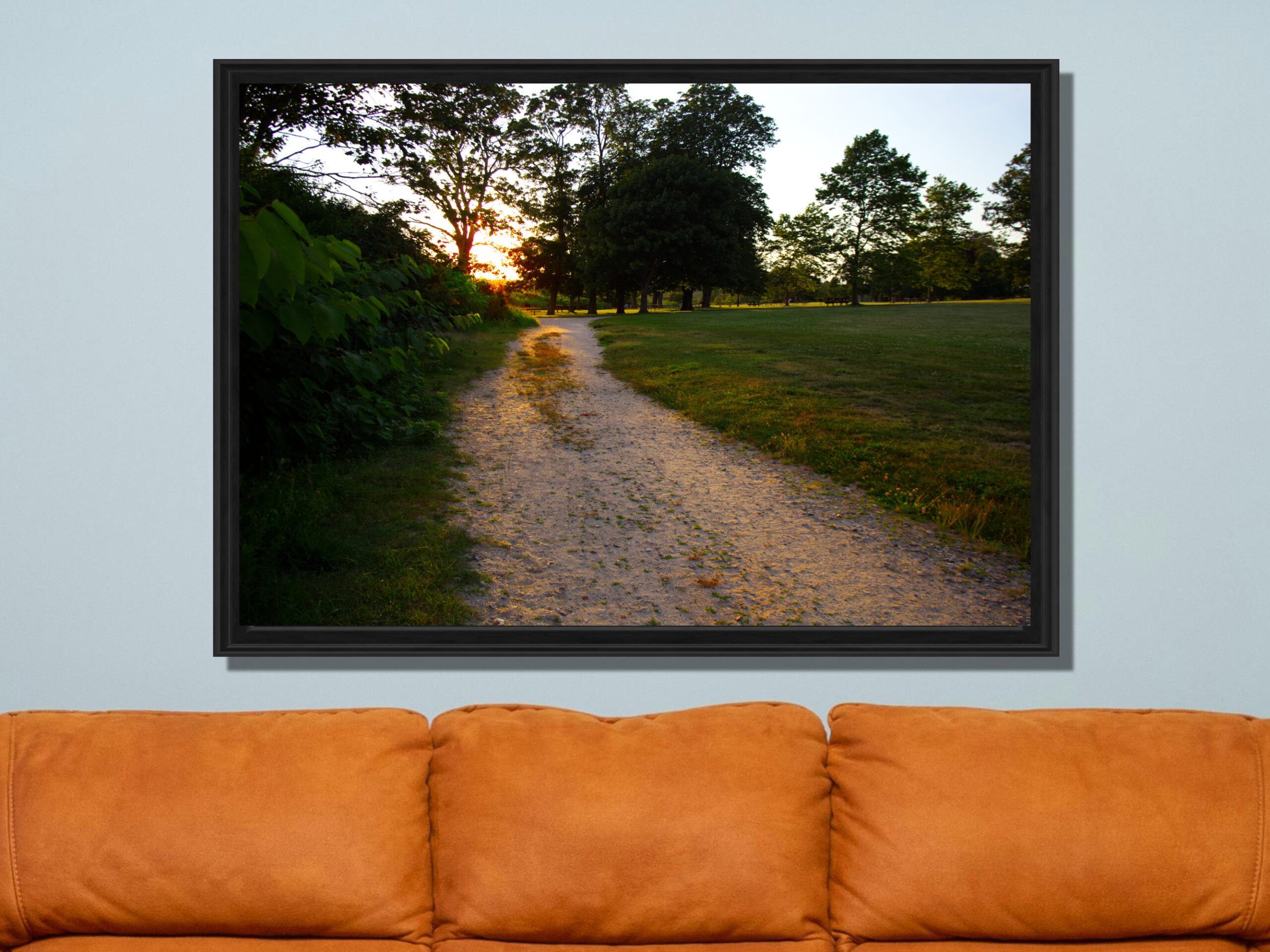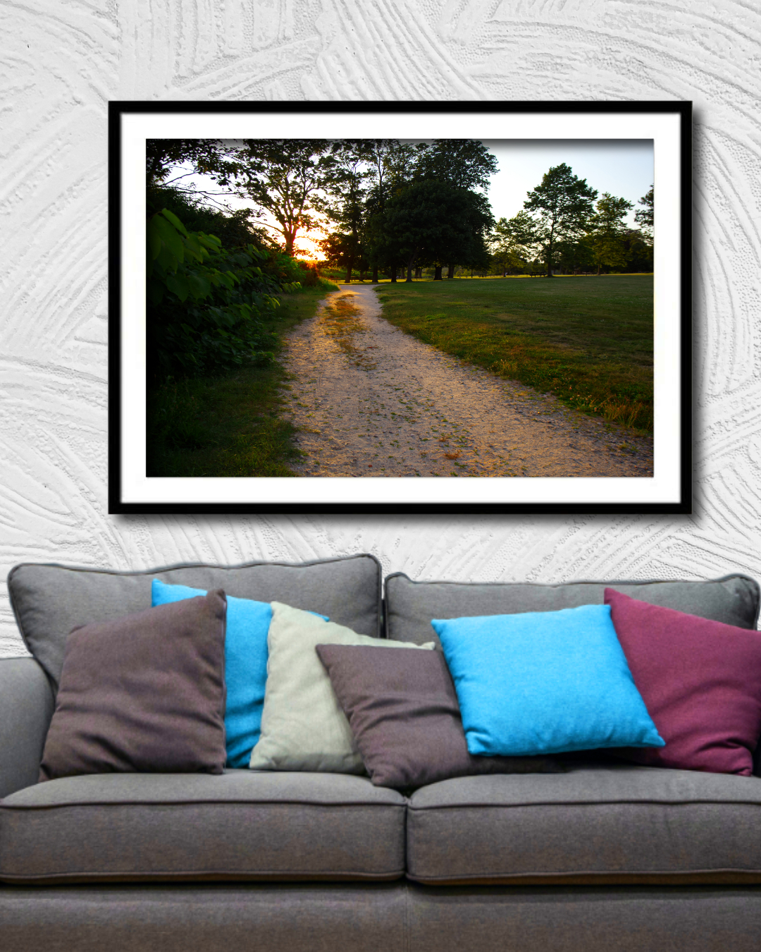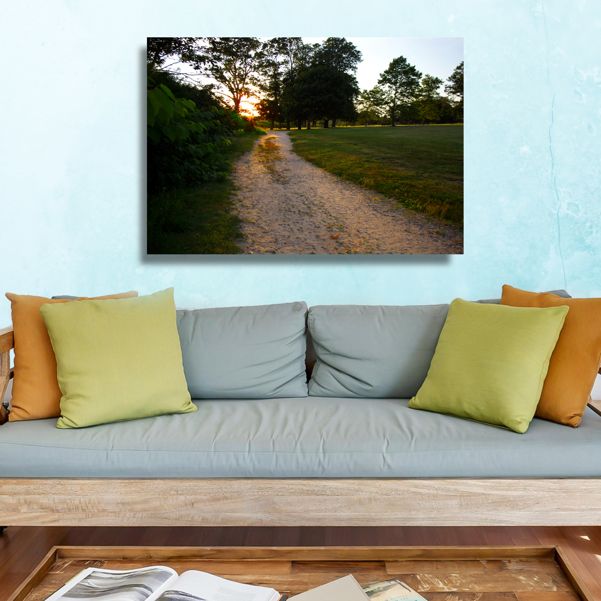Capture the calm of golden hour with this sunset park pathway wall art print. Featuring a winding gravel path, glowing sunlight through trees, and open green space, this peaceful landscape adds warmth to any room. A meaningful home decor gift for nature lovers and serene interiors.