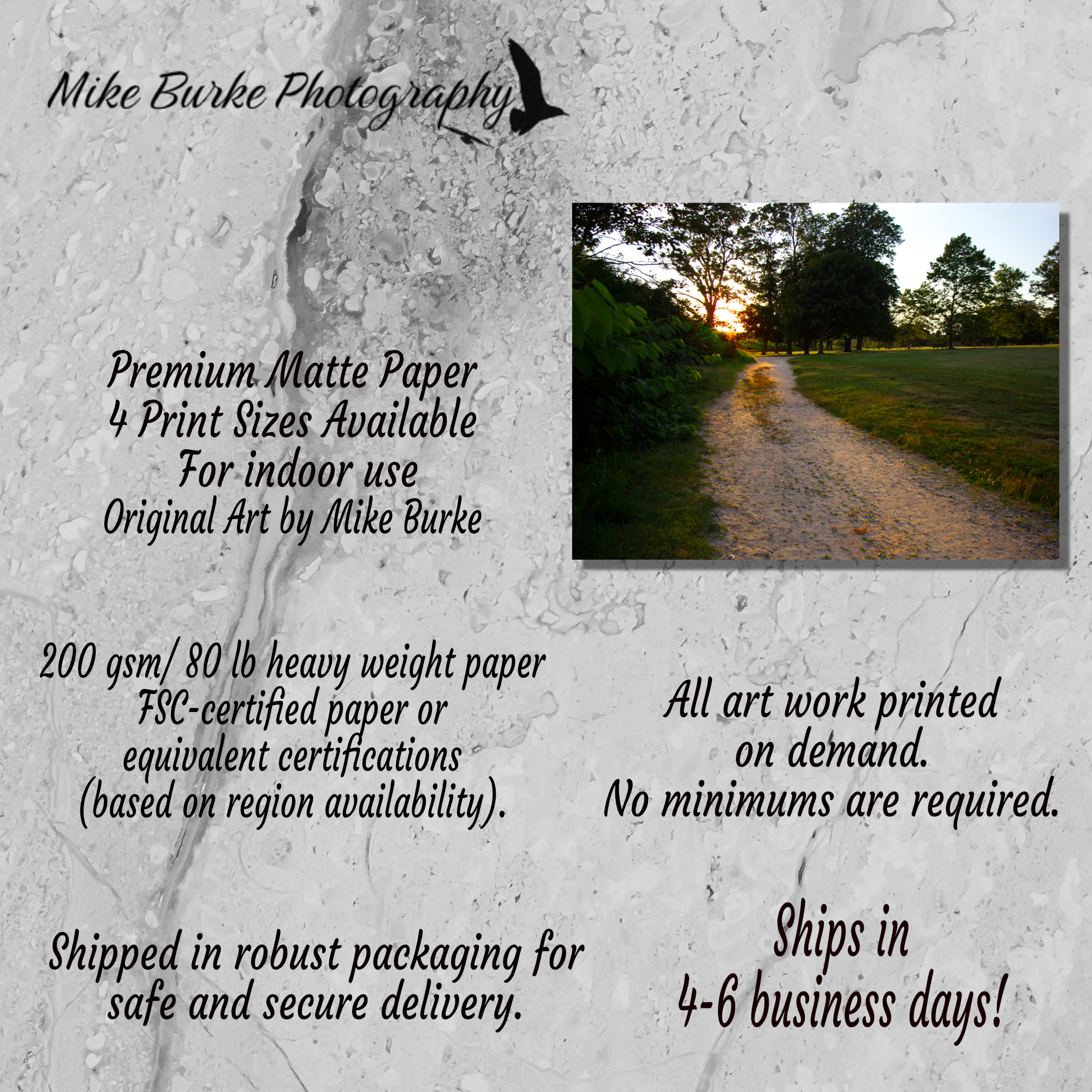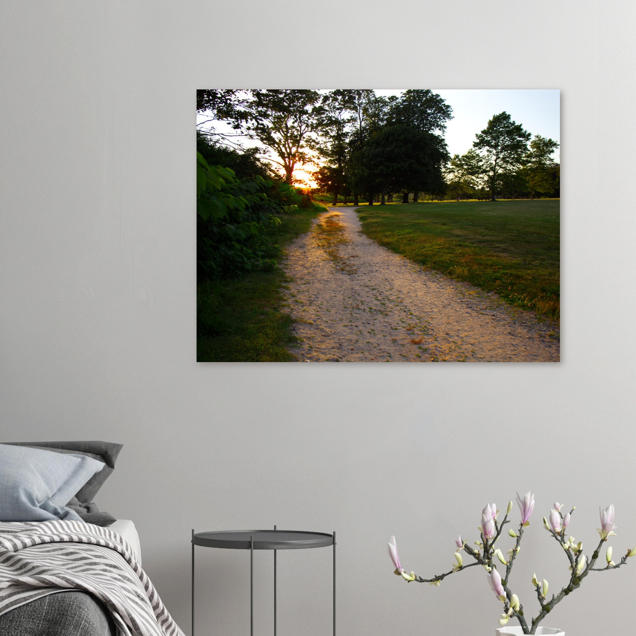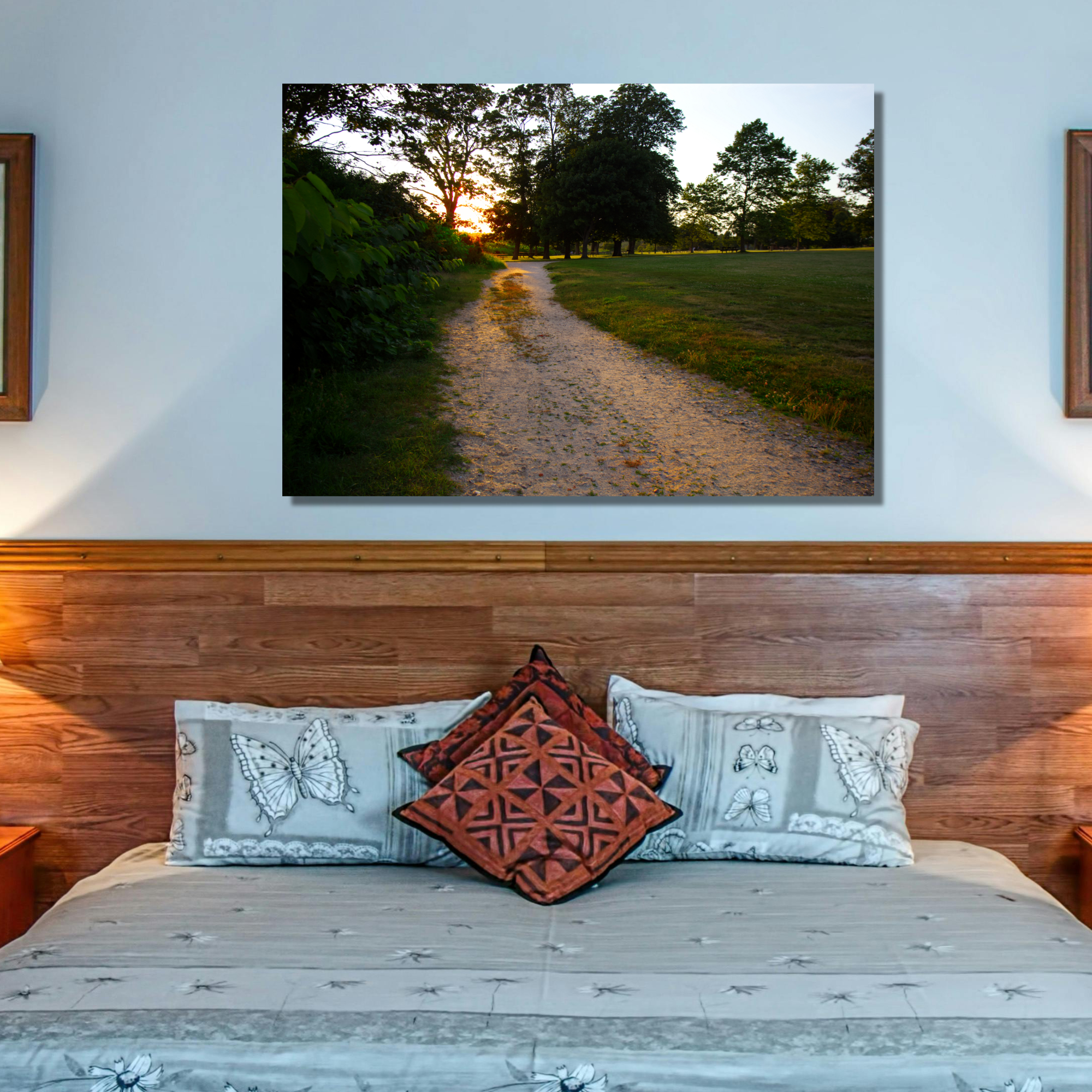 Capture the calm of golden hour with this sunset park pathway wall art print. Featuring a winding gravel path, glowing sunlight through trees, and open green space, this peaceful landscape adds warmth to any room. A meaningful home decor gift for nature lovers and serene interiors.