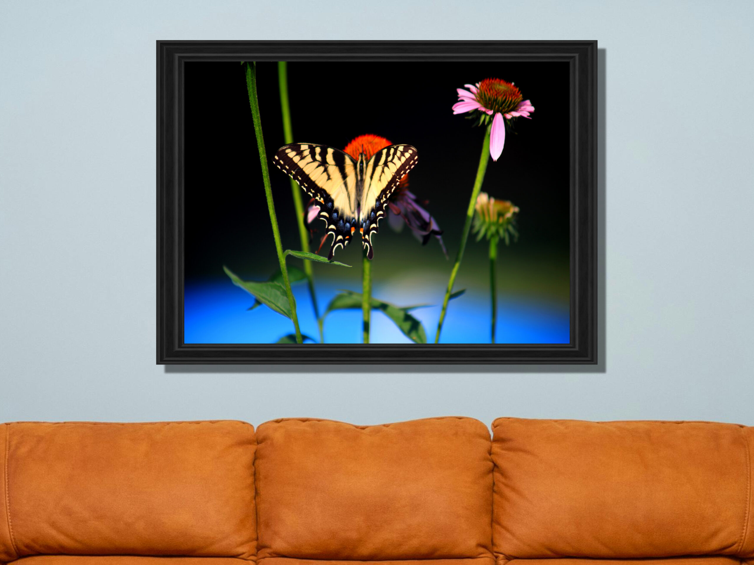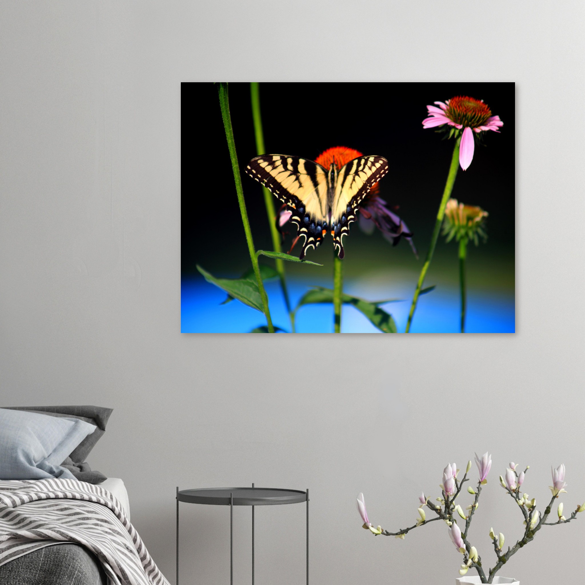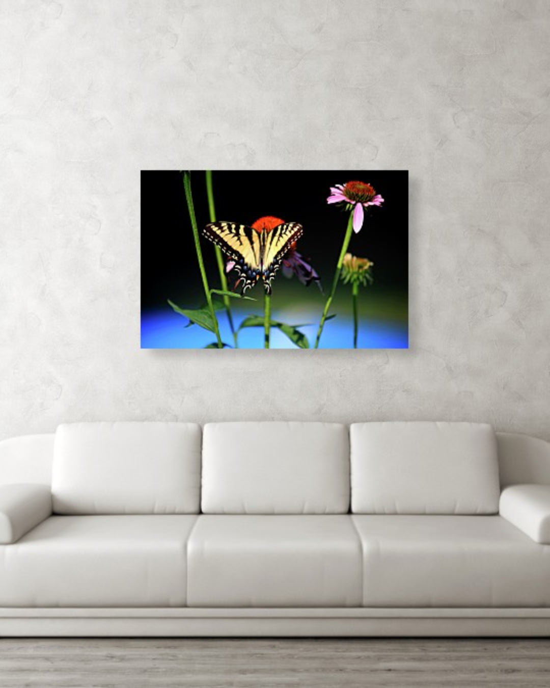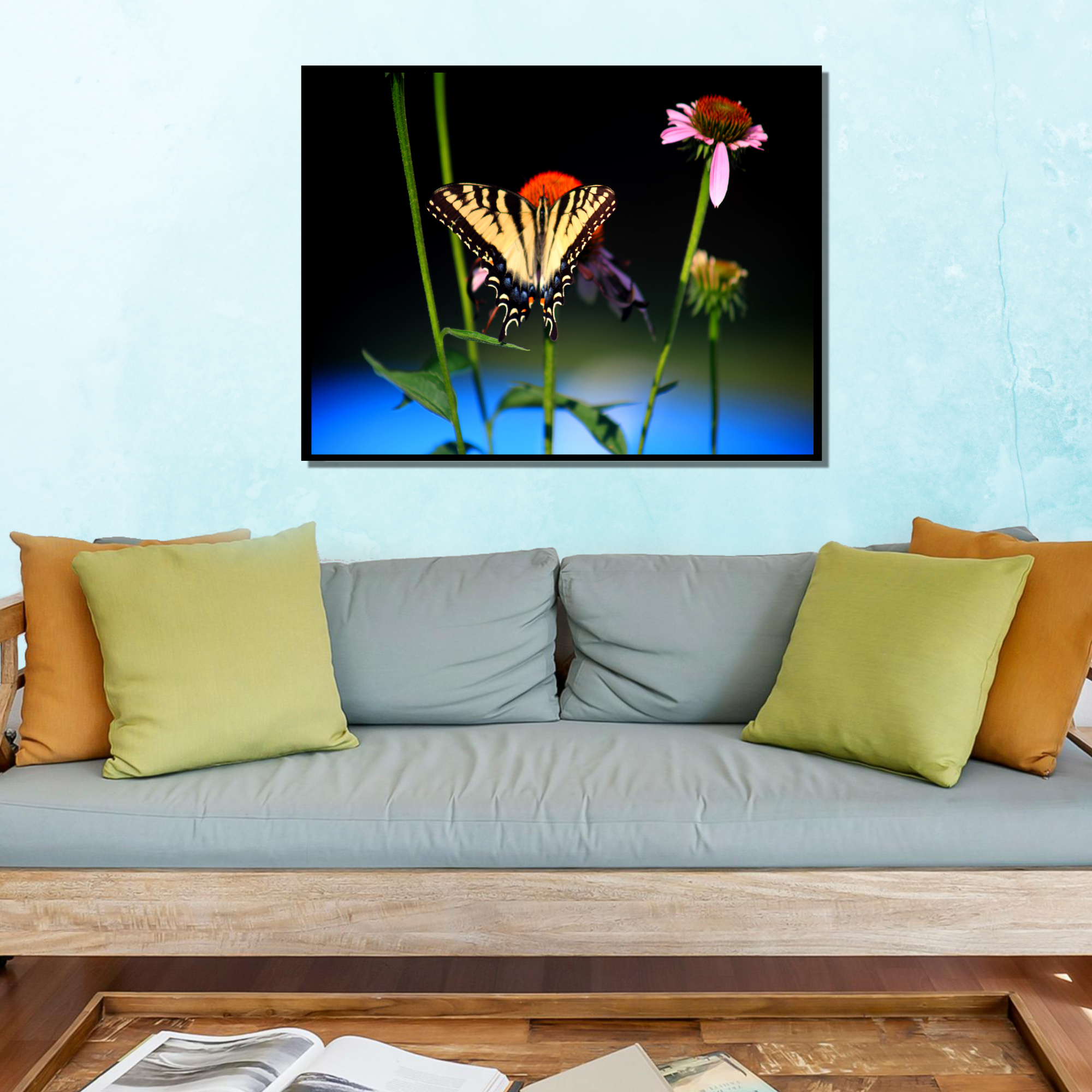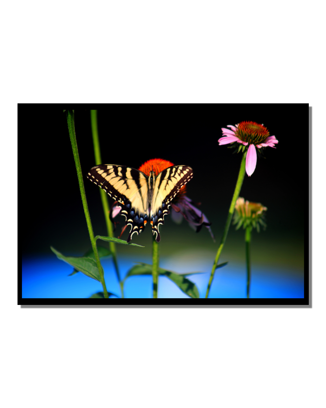 Showcasing a vibrant yellow and black swallowtail butterfly wall art print, with it resting on pink coneflowers, this striking nature photography wall art adds bold color and detail to any space. Perfect for garden lovers, it makes a unique home decor gift for nature and butterfly enthusiasts.